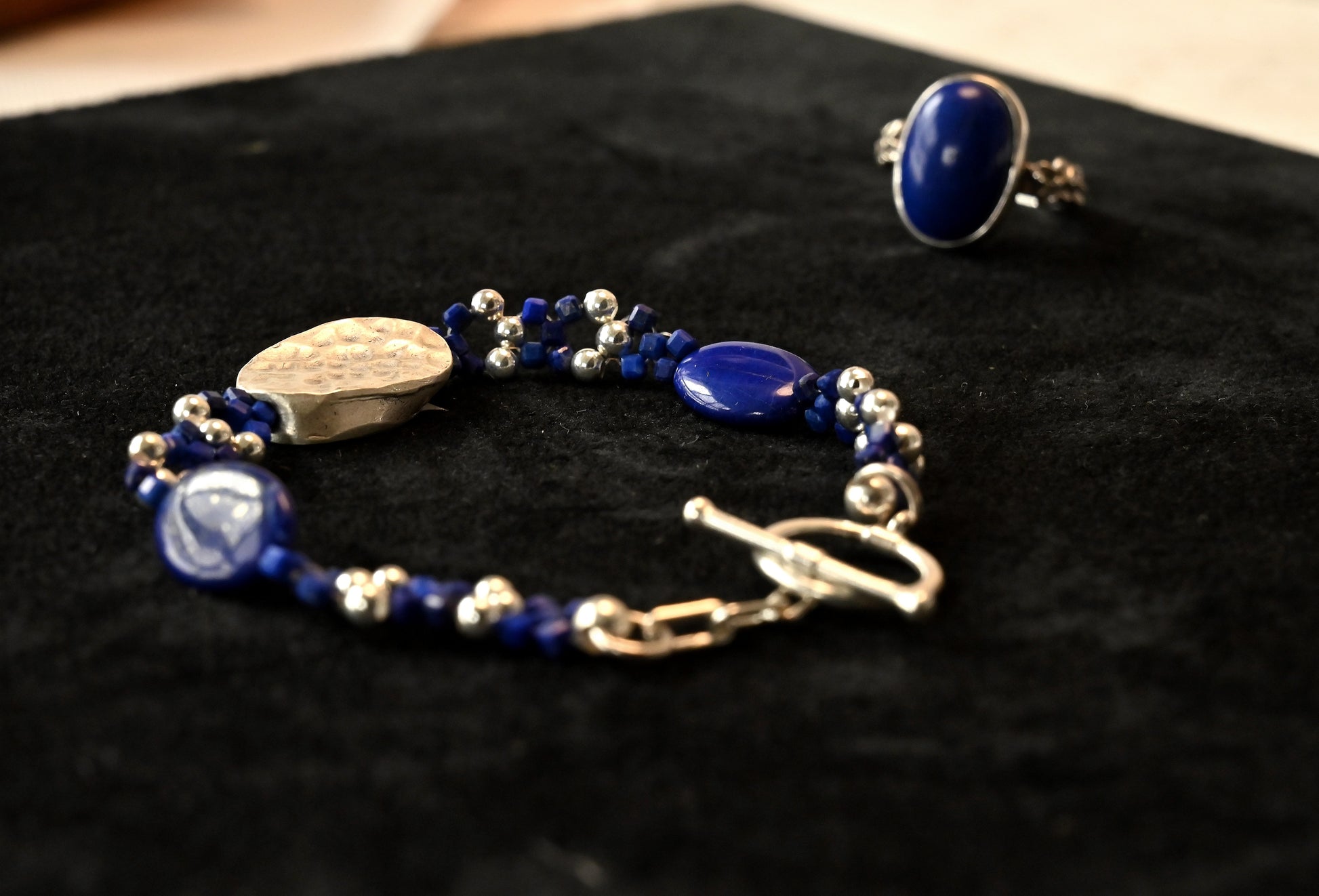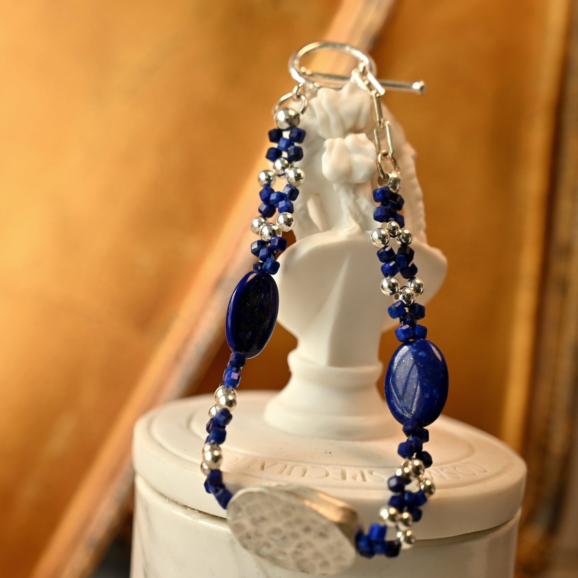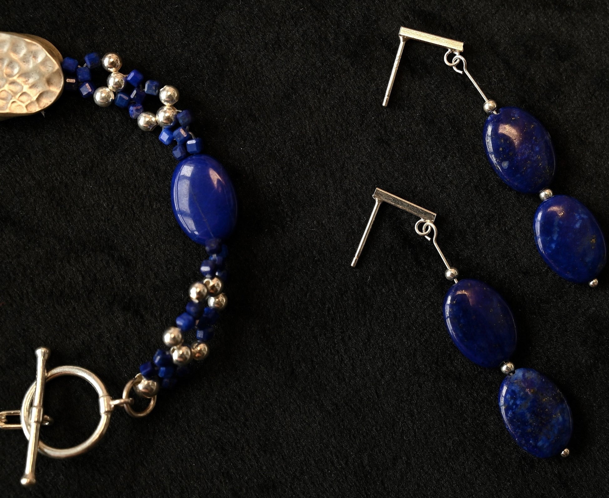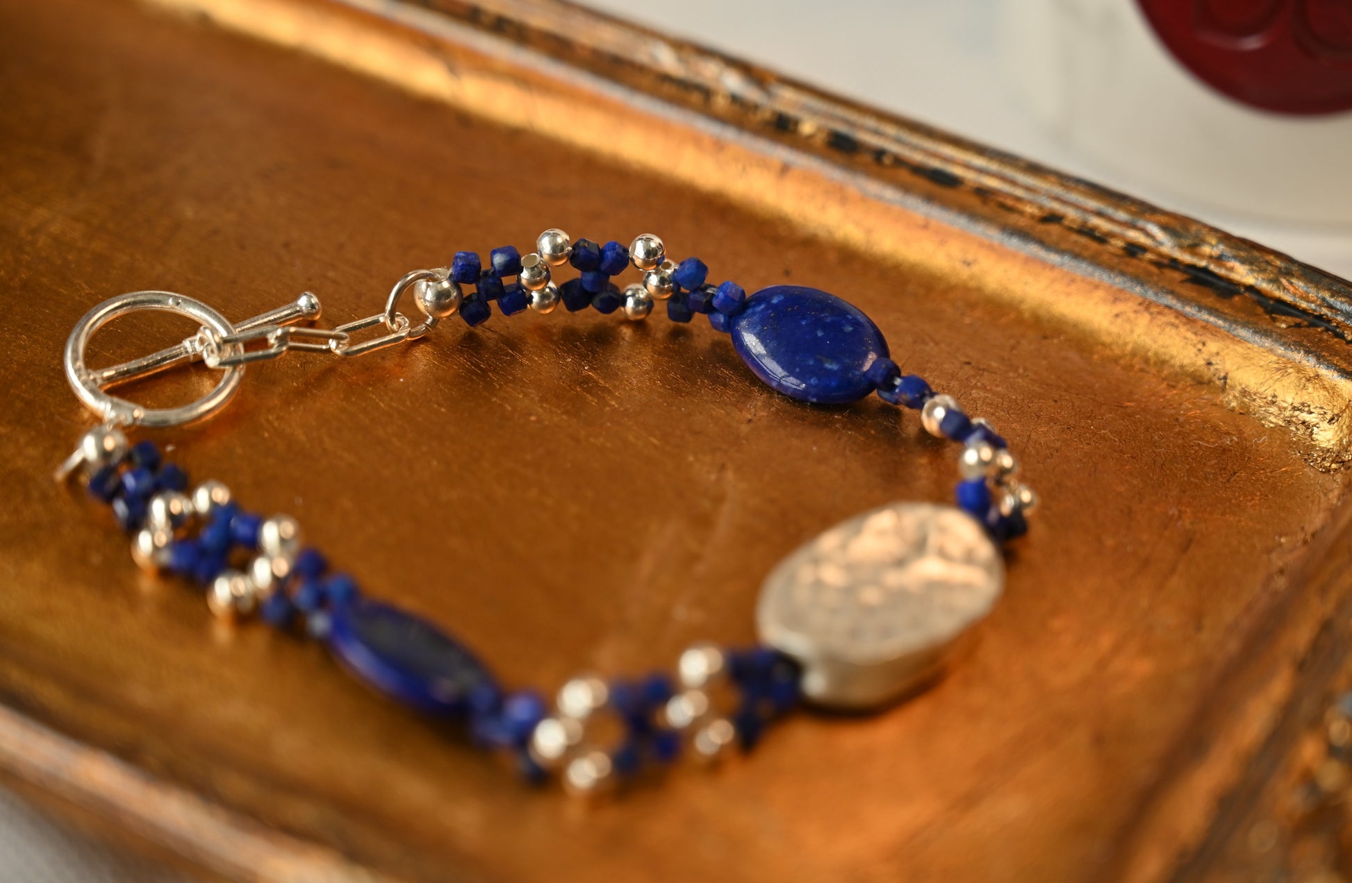Crafted in polished silver with genuine lapis lazuli stones, this set features a hammered pendant and intricate metal charms. The deep celestial blue evokes a starry night sky, while the vintage finish carries a whisper of timeless mystery and calm elegance.